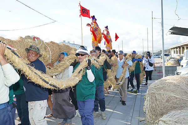 平敷屋の綱引きは毎年旧暦6月に行われ、他の地域の綱引きとこは異なり胴(本綱)から8本の手綱出て、形も蛸に似ていることから蛸綱と呼ばれています